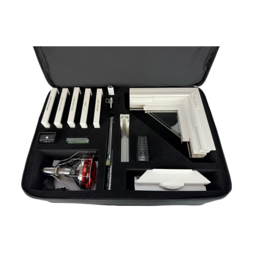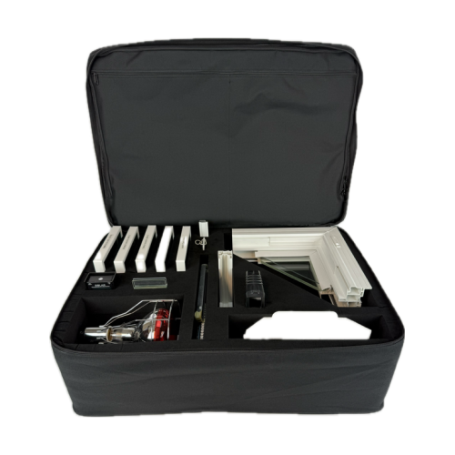 Here is another larger case option for those larger sales kits.  This combination gives you plenty of room for a good-sized corner cut window sample and some larger window frame components.  This larger case includes polished nickel-plated metal connectors to provide a durable case, and also a case that emits a very professional appearance. The cover includes a zippered pocket with an organizer designed into it. The organizer provides a location to store pens, business cards and other small accessories. Our standard padded shoulder strap and velcro gather for the handles is another great feature. The foam base includes locations for many of the popular window selling tools and window frame components.  Locations for a heat lamp, BTU meter, temperature gun, window samples and a variety of window frame components are all included.